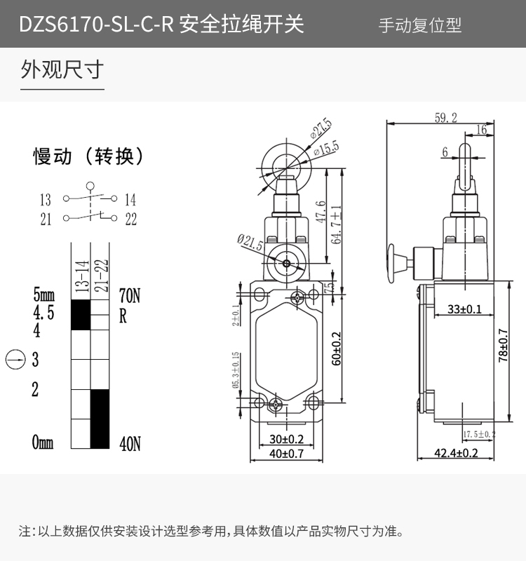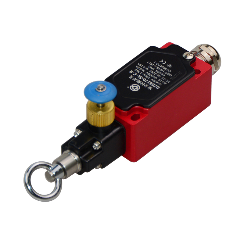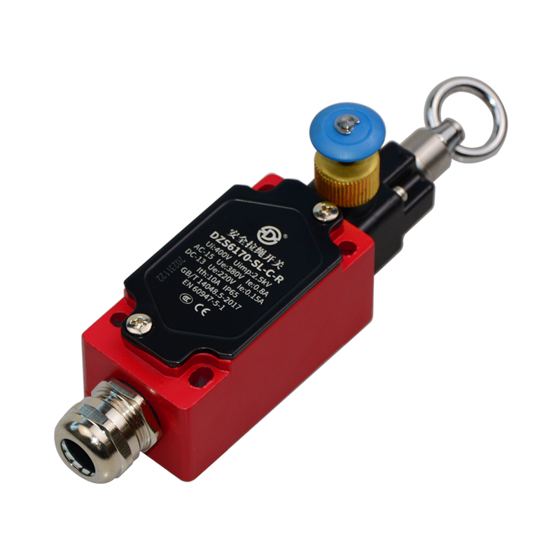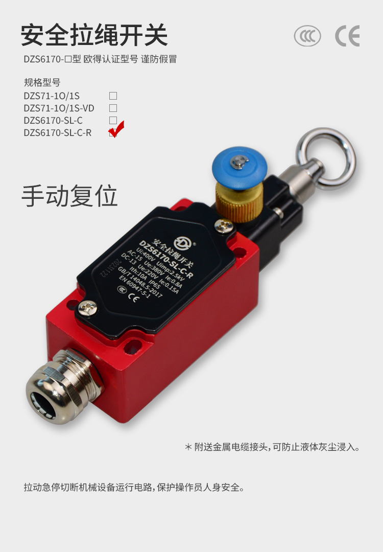 • DZS6170-SL-C-R安全拉繩開關(guān),拉動(dòng)式、急停鎖定型,藍(lán)色按鈕為手動(dòng)復(fù)位鍵。默認(rèn)接點(diǎn)為2回路(1常開1常閉)、可定制非標(biāo)2常閉(2NC)。金屬殼體,堅(jiān)固耐用。適用于流水線、輸送帶、高空作業(yè)車等機(jī)械設(shè)備位移信號(hào)控制,保護(hù)操作員不受機(jī)器傷害。額定絕緣電壓400伏,發(fā)熱電流10安培,工作電壓交流380伏、電流0.8安培,直流220伏、電流0.15安培,防護(hù)等級(jí)IP65,戶外使用請(qǐng)注意防水措施。