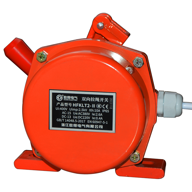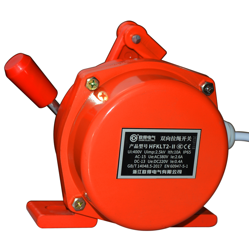 HFKLT2-Ⅱ雙向拉繩開關(guān),是用于膠帶運輸機現(xiàn)場,緊急事故停機的一種保護裝置。當(dāng)緊急事故發(fā)生時,在現(xiàn)場任意處啟動拉繩開關(guān),均可發(fā)出停機信號。絕緣電壓400伏,發(fā)熱電流10安培,工作電壓電流交流380伏、2.6安培,直流220伏、0.4安培,防護等級IP65。