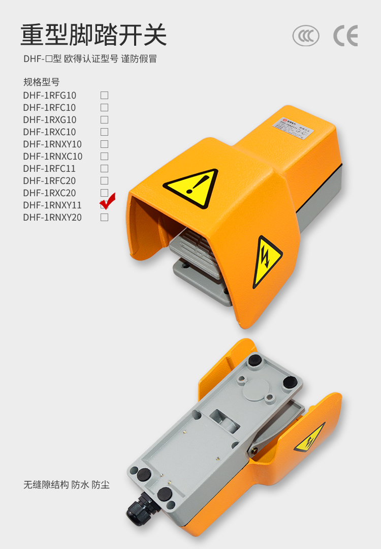 • DHF-1RNXY11腳踏開關(guān),三面防護(hù)罩,鑄鋁材質(zhì),加厚踩踏板,堅(jiān)固耐用。適用于數(shù)控鍛壓機(jī)械設(shè)備電路信號(hào)通斷控制。額定絕緣電壓380伏,發(fā)熱電流15安培,工作電壓電流交流250伏、15安培,防護(hù)等級(jí)IP60。