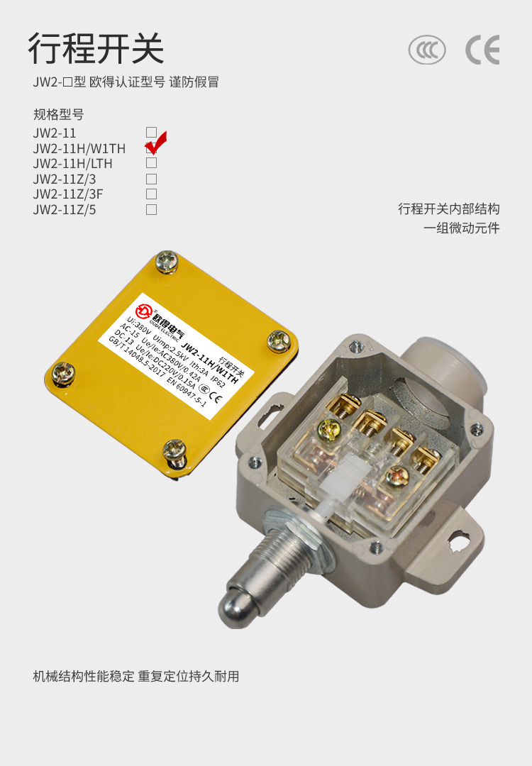 • 行程開關(guān)(JW2-11H/W1TH),柱塞直動(dòng)式。絕緣電壓380伏,發(fā)熱電流3安培,交流工作電壓380伏、電流0.42安培,直流工作電壓220伏、電流0.15安培,防護(hù)等級(jí)IP62。